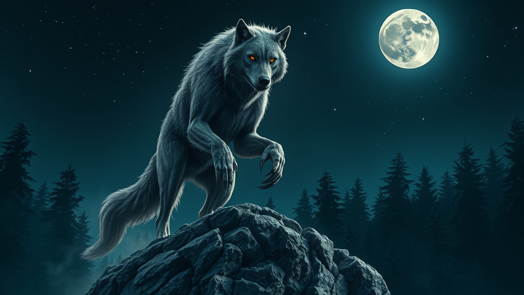 A lone werewolf under the full moon, its fur glistening with silver light, eyes glowing with an intense amber hue. The creature stands majestically atop a rocky cliff, surrounded by a dense, shadowy forest. Mist swirls around its paws, adding an ethereal quality to the scene. Long, muscular limbs give it an imposing presence, while its sharp claws curl slightly in anticipation. The night sky is clear, stars sprinkled like diamonds, creating a striking contrast to the dark, mysterious woods below.