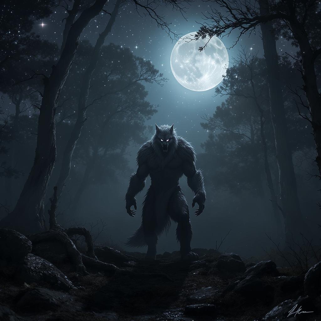 A lone werewolf, with thick fur and piercing eyes, stands under a full moon, its silhouette casting an elongated shadow on the forest floor. The night is alive with the ambient glow of moonlight filtering through the dense canopy above, highlighting the creature's muscular form. Surrounding it, mist rises from the damp earth, weaving through gnarled trees and ancient stones. This scene unfolds against the backdrop of a starry sky, where the air is cool, and the distant call of nocturnal creatures creates an eerie symphony. The werewolf, both majestic and terrifying, exudes an aura of primal power, poised between the wild and the mysterious night.