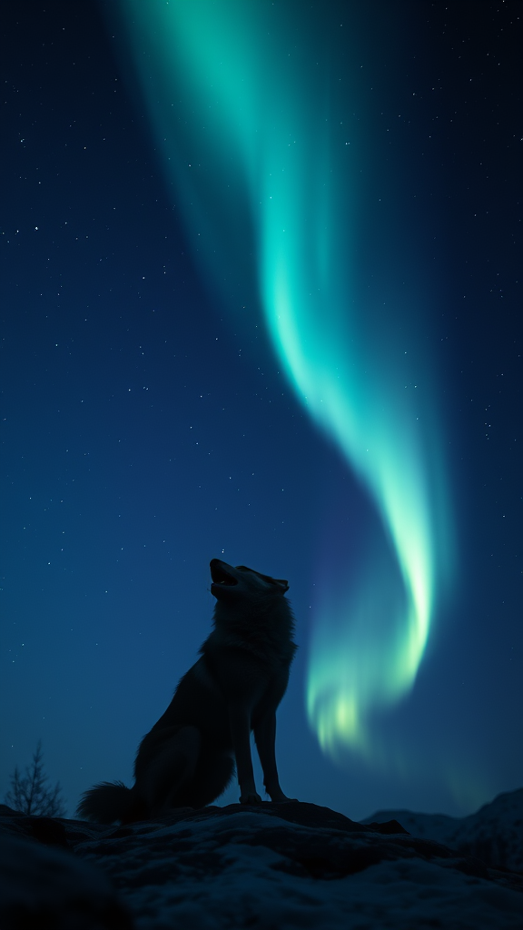 A lone wolf in majestic poise, howling beneath the shimmering aurora borealis, its silhouette sharp against the deep indigo of a star-studded night sky. The ethereal dance of colors cascades across the heavens, casting a mystical glow upon the scene. The landscape captures a serene, hyper-realistic scene shot with a 65mm lens, utilizing a long exposure to capture the celestial wonder and the wolf's form in perfect clarity. The faint rustle of a gentle night breeze whispers through the scene, completing the haunting, otherworldly atmosphere.