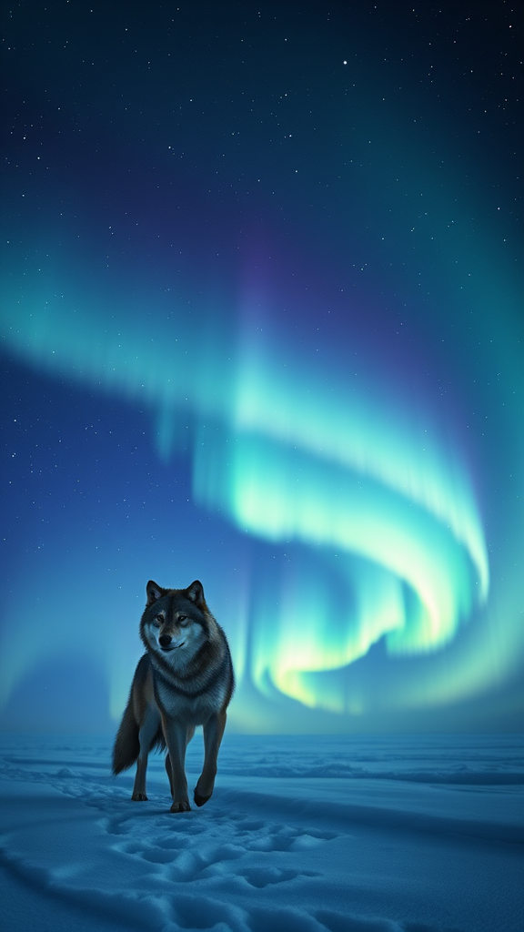 a lone wolf stands majestically beneath the shimmering aurora borealis, its silhouette stark against the glowing celestial display, four powerful legs grounded in the snow-dusted earth, the night sky a canvas of twinkling stars, captured in exquisite detail with a 65mm lens, long exposure reveals ethereal light trails, atmosphere hyper-realistic, aspect ratio 9:16, quality setting 2, version 4