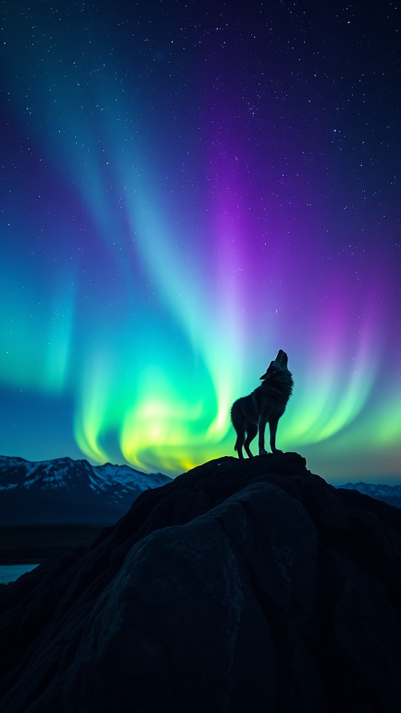 A lone wolf stands majestically on a rocky outcrop, silhouetted against the mesmerizing aurora borealis that dances across the night sky, casting vibrant shades of green and purple. Its four powerful legs steady on the rugged terrain, the wolf howls, echoing into the vastness under a blanket of twinkling stars. The scene is captured in stunning photorealism on a high-resolution 65mm film, with a long exposure that enhances the ethereal glow of the northern lights and the sparkling clarity of the starlit sky, creating a breathtaking composition in a 9:16 aspect ratio, with exceptional quality and vividness.