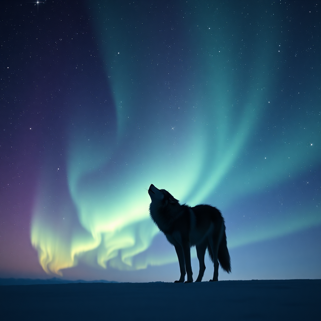 A lone wolf stands silhouetted against the mesmerizing aurora borealis, its silhouette framed by the night sky filled with twinkling stars, capturing a moment of serene beauty and wild elegance. With all four legs grounded firmly on a snowy landscape, the wolf tilts its head upwards, howling softly into the vast, starry expanse. The scene is rendered in hyper-realistic detail, as if shot on a 65mm lens with a long exposure, emphasizing the vivid dance of colors in the aurora and the intricate textures of the wolf’s fur, set against the deep, infinite backdrop of the night sky.