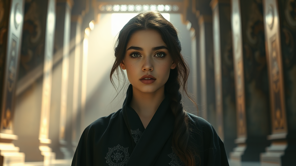 A lone young woman wearing intricately detailed dark robes stands in a grand temple, enveloped in a dramatic play of light and shadow. Her symmetrical eyes are mesmerizing, reflecting the ornate architecture surrounding her. The shot captures the scene with stunning realism and sharp focus, akin to a high-definition photograph in ultra-high resolution. The image gives off a sense of hyperrealism, achieved through advanced ray tracing and physics-based rendering techniques. Every element, from the texture of the stone wall to the delicate fabric of her robes, is rendered with impeccable detail, creating a seamless and captivating visual experience, reminiscent of a highly detailed RAW color photo.