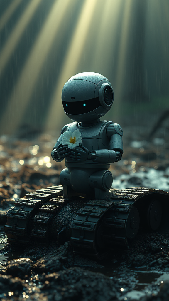 A lonely robot cradles a delicate blossom amidst a backdrop of cinematic lighting, with soft volumetric rays piercing through. The scene is moody, with glistening drops of rain falling onto mud that splatters and drips around the robot's tracks. The atmosphere is melancholic yet hopeful, as the juxtaposition of technology and nature creates a poignant moment of beauty.