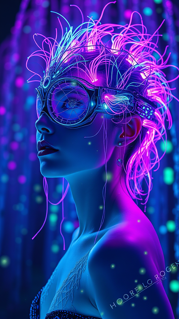 A long-shot, full body portrait of a woman with a lucid blend of weirdcore and cybercore elements, looking into the distance. She is adorned with bioluminescent biomechanical filaments that glow intensely, emerging from her skin. Her intricate headpiece resembles detailed marginalia, creating a mesmerizing visual effect. The woman is gorgeous, wearing a mask crafted from fiber-optic threads, with bright neon lights illuminating in a spectrum of blue, green, and purple. The background is a glowing forest, a vivid neon wonderland dreamscape filled with floating particles. The composition follows the rule of thirds and the golden ratio, achieving a balance between photorealism and cinematic realism. Rendered with octane for hyper-detailed visuals and showcasing raytraced shadows and depth of field, the asymmetrically composed scene is captured with unreal engine in stunning 8k resolution, delivering a hypermaximalist experience.