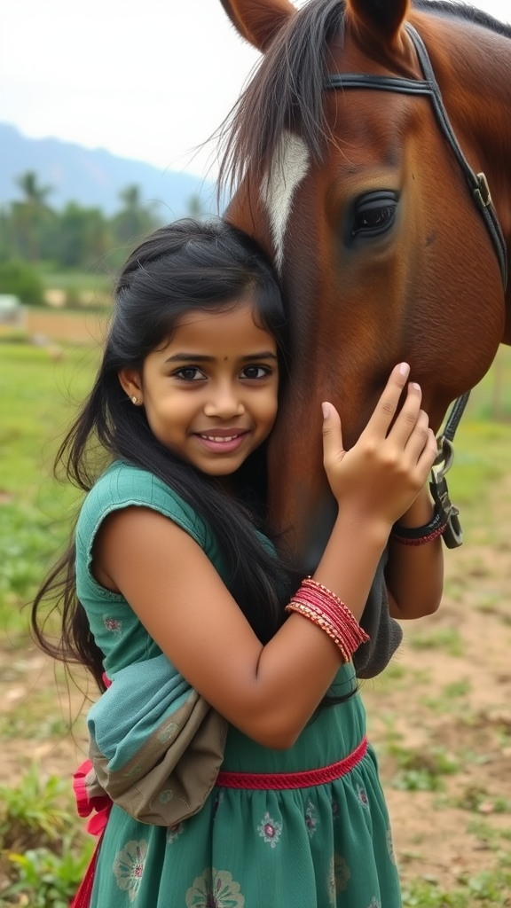 A lovely young Indian girl gently embracing the head of a graceful horse, her soft smile reflecting a bond of kindness and warmth amidst a picturesque rural backdrop.