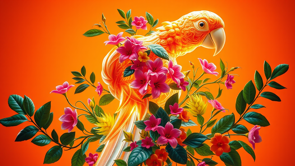 A luminescent abstract 3D form resembling a parrot, intricately entwined with vibrant foliage and blossoms, set against a radiant orange backdrop.