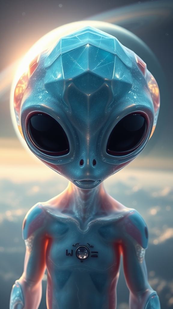 A luminescent alien composed of radiant crystal with two large, glossy black eyes radiating depth and emotion, stands against the backdrop of a distant planet orbiting on the horizon, with shimmering rings casting ethereal glows across the cosmos.