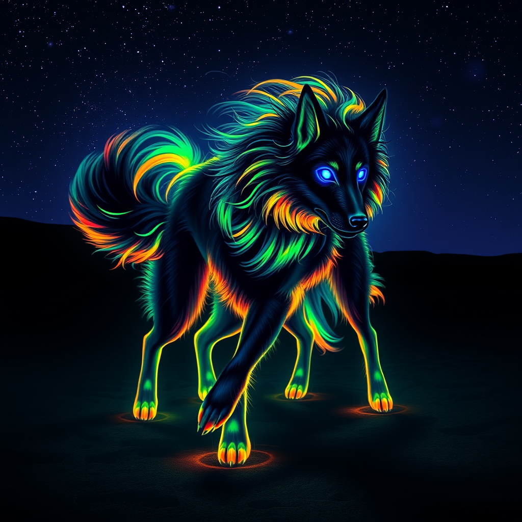 A luminescent canine with an ebony coat that seems to absorb and re-emit a spectrum of neon hues, swirling gracefully beneath a starlit sky, casting eerie shadows across the ground while its eyes glow like twin ultraviolet orbs, guiding it through the darkness with an ethereal, otherworldly aura.