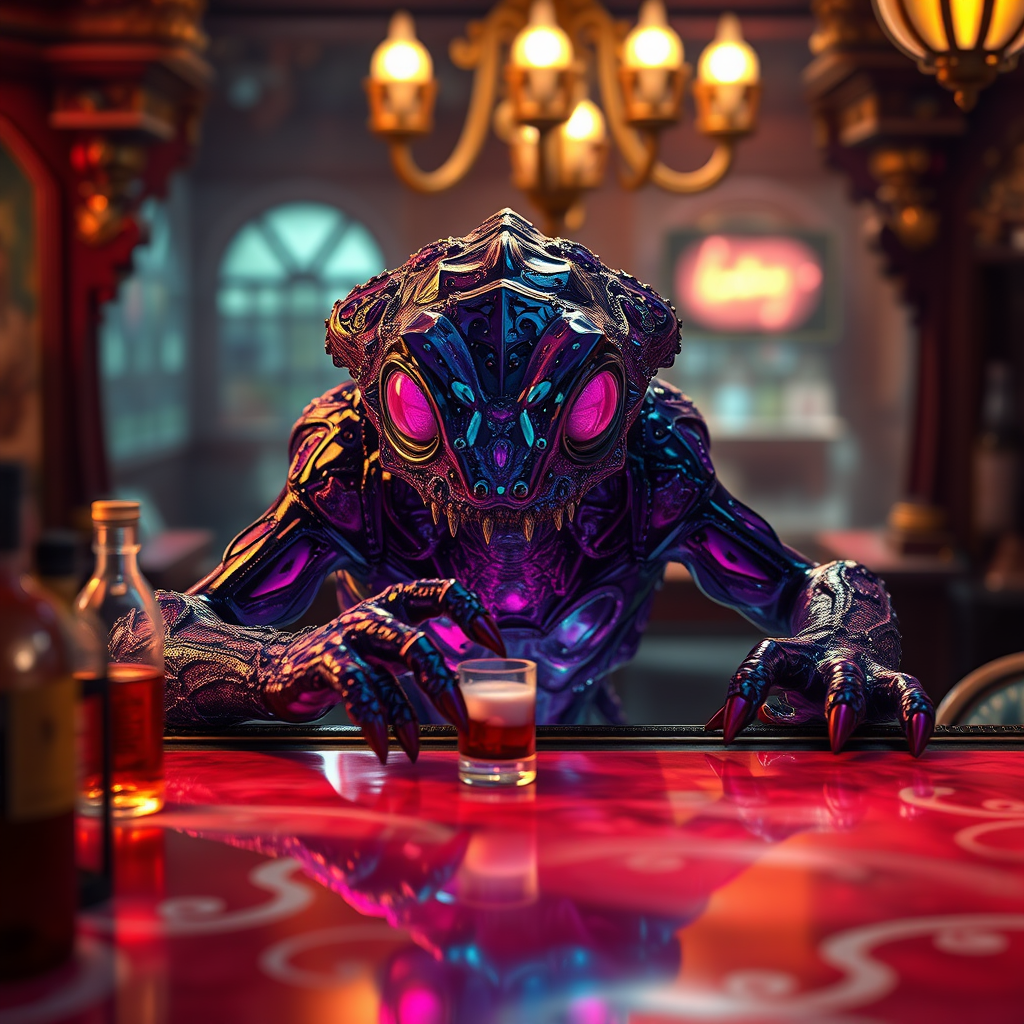 A luminescent garnet creature indulging at a Victorian-style bar, its wet, crystalline form glistening under steampunk influences. Captured in a stunning, hyper-realistic 3D render with octane precision, the scene is intricately detailed with a sharp cinematic focus. Set in an isometric view, the garnet monster is centrally poised, its features accentuated by dramatic rim lighting. The bar's ambient bokeh and depth of field create a mesmerizing backdrop, making it a visual masterpiece trending on ArtStation.