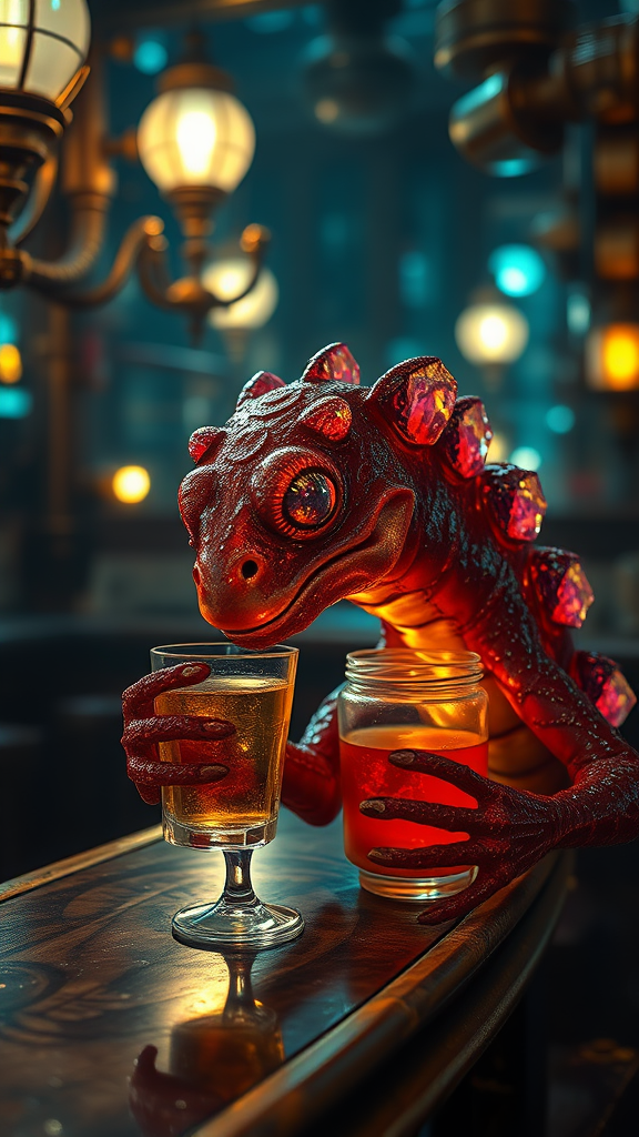 A luminescent garnet creature sips its drink in a bustling steampunk bar, captured in a stunning realistic photograph. Its wet, crystalline structure glistens under the soft glow of intricate, detailed lighting, rendered in a cinematic 3D style with Octane render. The setting is finely focused, sharp with every detail, trending on ArtStation for its exquisite isometric composition. Rim lighting highlights the creature's contours against a blurred bokeh backdrop, creating depth and allure. The scene is an artistic masterpiece, encapsulating the vibrant essence of a fantasy realm in fine detail.