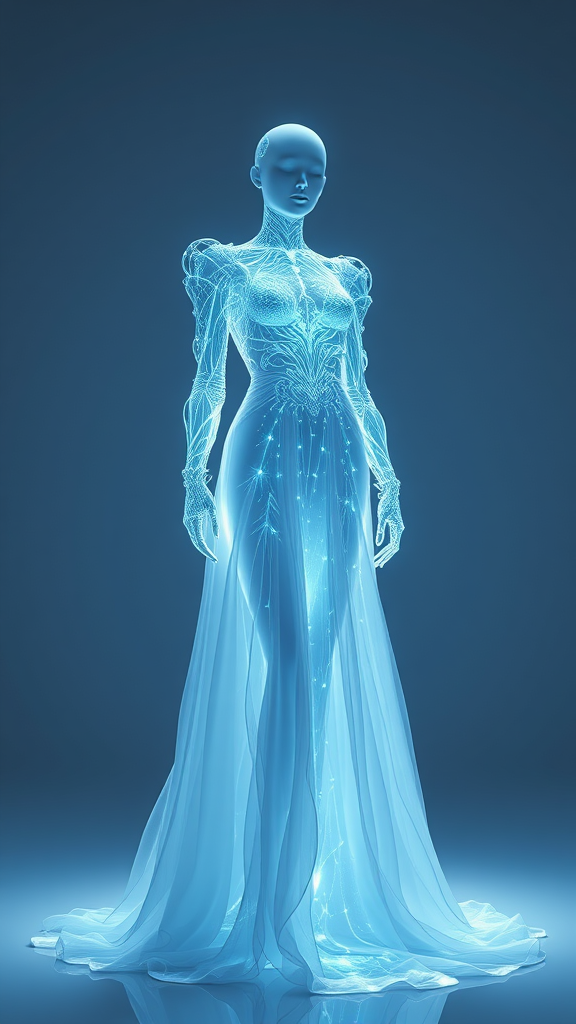 A luminescent gown by HiveArt blending electronic fashion with artistic photography, crafted in Cinema4D style, featuring white and cyan hues, abstract anatomy, reminiscent of Syd Mead and Anastasiya Dobrovolskaya's visionary aesthetics, showcasing ultrafine detail in a striking 8k 3D render with a ratio of 51:91, featuring a surreal ambiance and innovative textile technology.