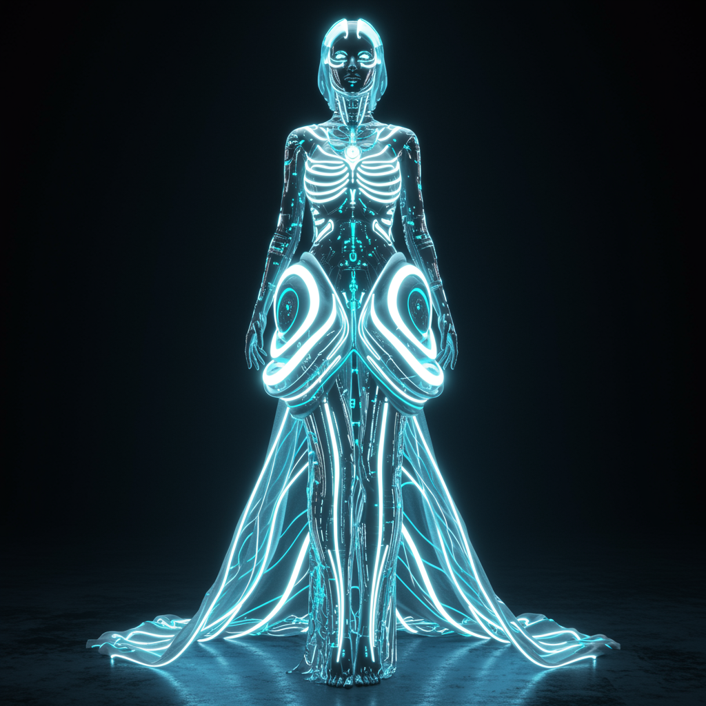 A luminescent gown designed by hiveart blending electronic fashion concepts, captured in an artful photoshoot, rendered in Cinema4D. The dress features a play of white and cyan light patterns, with an abstract, ethereal anatomy inspired by Syd Mead and photographed by Anastasiya Dobrovolskaya. The scene is depicted with ultrafine detail and high resolution, immersing viewers in an 8k 3D experience, while the proportions are elongated in a 51:91 aspect ratio, achieving a harmonious balance of technological elegance and avant-garde style.