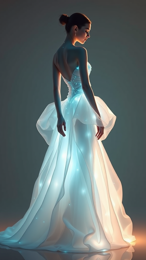 A luminescent gown designed by Hiveart for an electronic fashion art photoshoot, rendered with cinematic precision in Cinema4D, featuring a harmonious blend of white and cyan shades. The ensemble exhibits a dreamy, undefined anatomy, drawing inspiration from the visionary style of Syd Mead and the ethereal touch of Anastasiya Dobrovolskaya. With ultrafine detail, the piece is captured in stunning 8k 3D resolution, showcasing a futuristic yet elegant silhouette with a unique aspect ratio of 51:91 and a dynamic setting of 750, highlighting the intersection of technology and fashion.