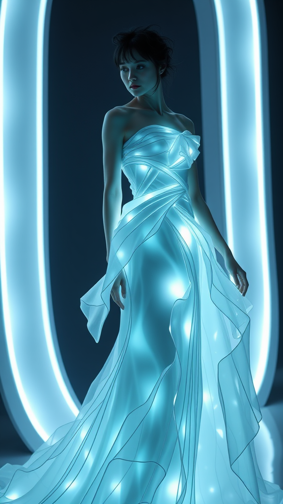 A luminescent gown designed by Hiveart, glowing in shades of white and aquamarine, captured in an avant-garde fashion photoshoot using Cinema4D rendering techniques. The dress merges futuristic elegance with abstract form, reminiscent of Syd Mead's visionary style. This creation embodies a blend of detailed intricacy and ethereal fluidity, evoking the surreal essence of Anastasiya Dobrovolskaya's photography. Rendered in ultra-high-definition 8K 3D, it presents an enchanting spectacle of light and design.