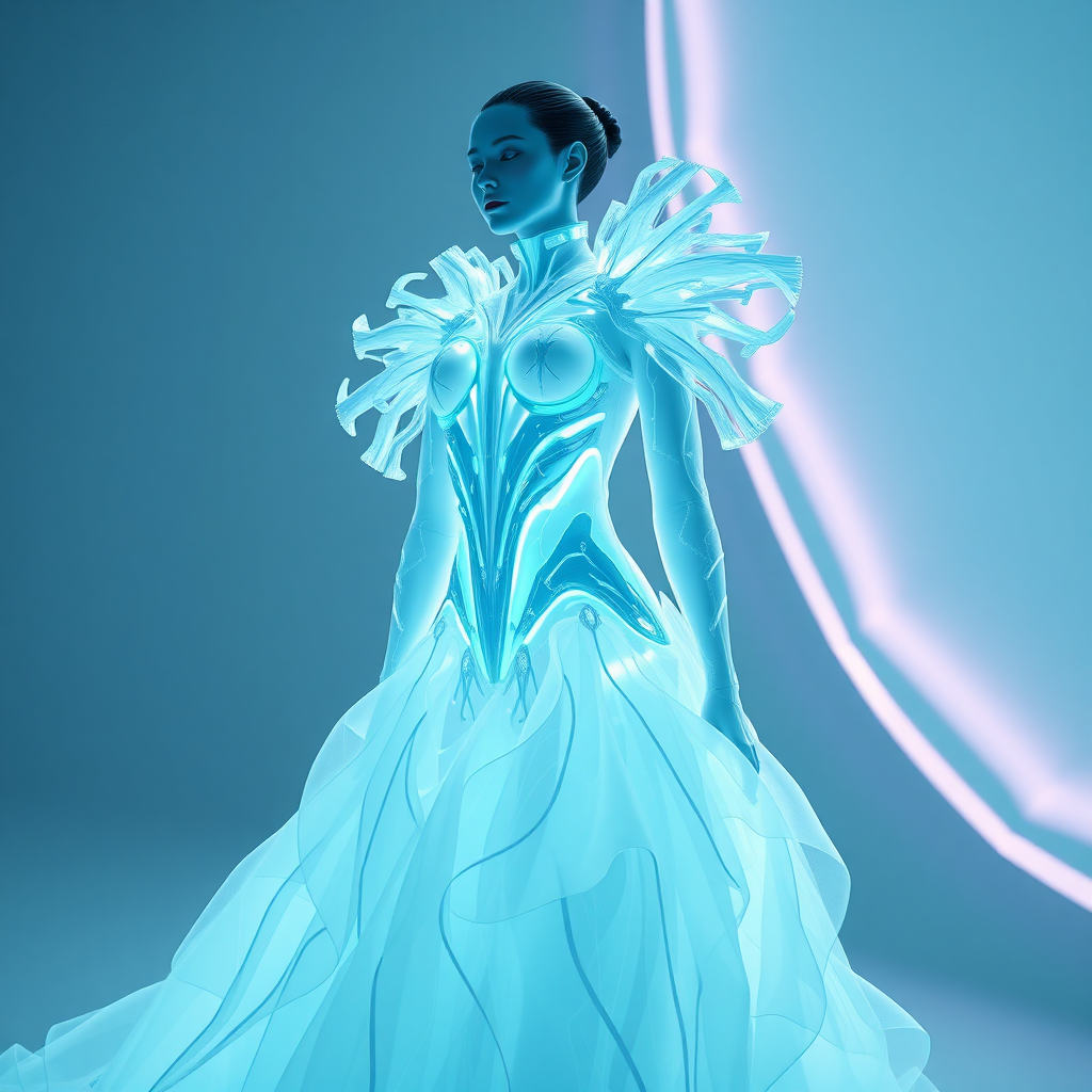 A luminescent gown inspired by hiveart electronic fashion, captured in a futuristic photo shoot, rendered in cinema4d with a palette of white and cyan. The design features an abstract anatomy reminiscent of Syd Mead's visionary style and Anastasiya Dobrovolskaya’s ethereal touch. The garment showcases ultrafine detail and 8k 3d quality, evoking a sense of elegance and modernity, with a cinematic aspect ratio of 51:91 and a creative index of 750, version 5.1.
