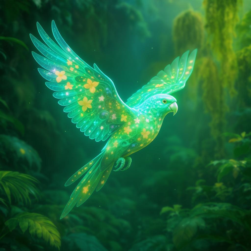 A luminescent parrot with an abstract 3D form soars gracefully through a lush verdant expanse, its wings a vibrant mosaic of swirling foliage and blossoming flowers that emit a soft, ethereal glow in the emerald-tinted surroundings.