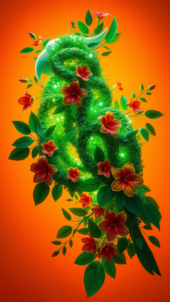 A luminous 3D parrot shape intertwined with lush green foliage and vibrant flowers, glowing softly against a warm orange backdrop.