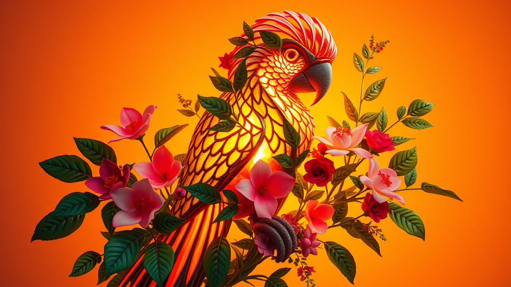 A luminous abstract 3D parrot form crafted with lush foliage and vibrant blooms emerges, casting a warm glow against an amber backdrop.