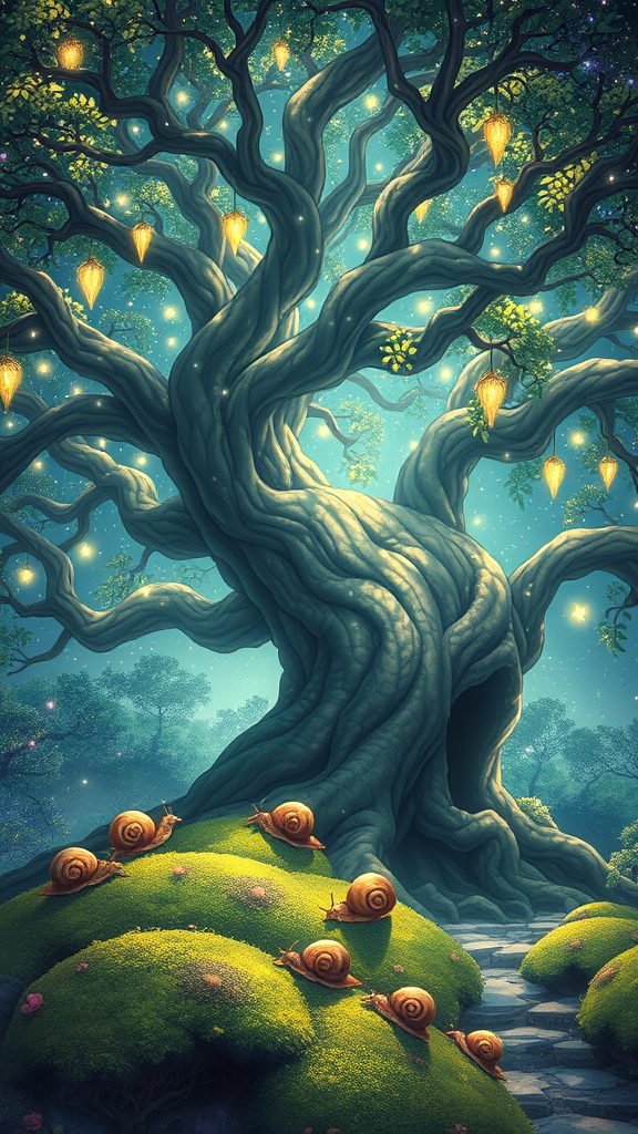 A luminous anime style scene depicting an ancient tree with a sprawling canopy filled with twinkling stars, casting shimmering light across a richly detailed landscape. The artwork embodies the essence of art nouveau with intricately woven branches and delicately carved leaves. The pristine naturalism of the setting highlights vibrant flora and fauna, with whimsical snails weaving their trails across moss-covered roots. The scene radiates a mystical Dungeon & Dragons feel, where adventurers might gather under the dazzling starlit tree, bathed in an ethereal glow. The art is suffused with an enchanting light, creating a magical ambiance where each detail, from the soft rustle of leaves to the gentle luminescence, tells a story of wonder and tranquility.