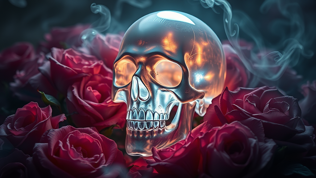 A luminous crystal skull encircled by lush, blooming roses, exuding an aura of dark fantasy and ethereal magic. Captured in a breathtaking and theatrical composition, the scene is illuminated with cinematic lighting, revealing every intricate detail and ornate design. This image evokes the enchanting style of Brian Froud, with a mystical, otherworldly quality, suitable for a stunning UHD, HDR, 8k fantasy art wallpaper. Gentle wisps of mist swirl around the skull, catching the light in a dance of mystery, while shadows play softly among the petals, enhancing the enchanting atmosphere.