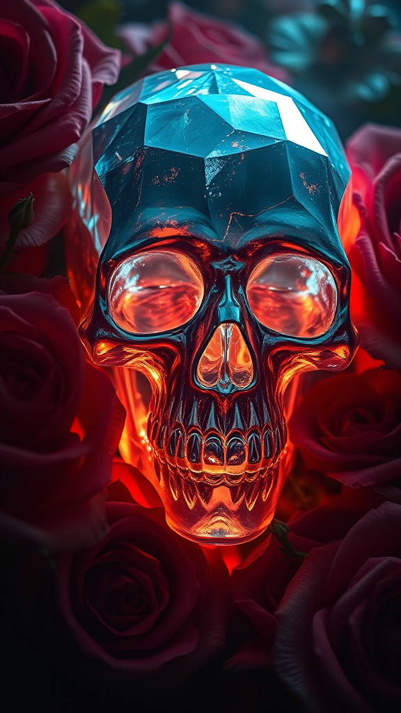 A luminous crystal skull enveloped by lush, velvety roses, exuding an ethereal dark fantasy aura. Bathed in cinematic lighting, the scene is captured with an epic atmosphere, designed as a stunning wallpaper. Each element is rendered in extreme detail, creating an ornate masterpiece reminiscent of Brian Froud's style. The image is a masterful blend of fantasy art, enhanced to UHD, HDR, 8k quality. The skull's crystalline facets reflect and refract light, casting magical glows amid the deep crimson petals, while mystical shadows add depth and intrigue to this enchanting tableau.