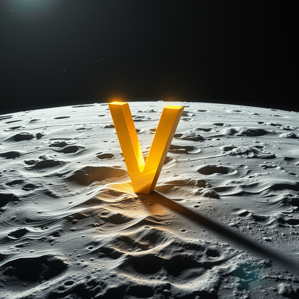 A luminous golden letter V stands majestically on the moon's surface, surrounded by the vast emptiness of space. The 3D-rendered letter exudes a soft, ethereal glow, reflecting the light from distant stars. The lunar landscape is intricately detailed, casting gentle shadows beneath the letter amidst the moon's craters and ridges. A breathtaking cinematic lighting casts an atmospheric depth to the scene, capturing the tranquil yet awe-inspiring beauty of this surreal cosmic moment.