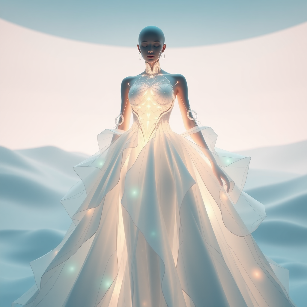 A luminous gown powered by hiveart technology showcased in an electronic fashion art photoshoot, rendered in cinema4d style, with a blend of white and cyan hues. The design features abstract anatomy inspired by Syd Mead and Anastasiya Dobrovolskaya, with ultrafine detail captured in 8k 3d resolution, aspect ratio 51:91, styled with a surreal touch and a softness setting of 750, version 5.1.