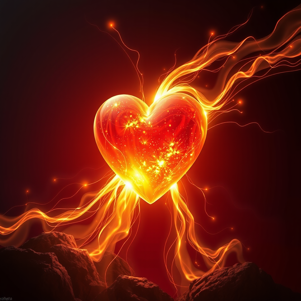 A luminous heart melting into golden streams of light, set against a red-black gradient background with dynamic, cinematic lighting; the image boasts photorealistic fantasy elements characterized by breathtaking detail, inspired by renowned artists Artgerm, Greg Rutkowski, Peter Mohrbacher, and Guweiz. The heart appears ethereal, its radiant glow contrasting starkly with the dark background, creating a captivating visual balance. Rich textures and intricate visual layers contribute to an atmospheric spectacle, evoking a sense of awe and wonder in the viewer. The scene is alive with a surreal blend of realism and dream-like fantasy, capturing the essence of mythical elegance and creative storytelling.