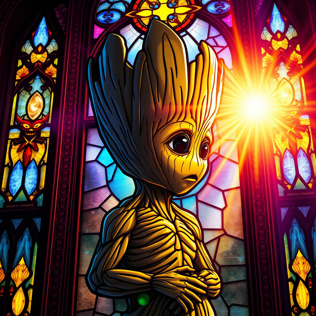 A luminous stained glass window depicting baby Groot, intricately crafted with vibrant colors, emitting a heavenly glow reminiscent of religious iconography. The design features ornate Gothic cathedral elements, with an ethereal backlighting that enhances its radiance. The artwork is highly detailed, merging styles inspired by Clive Barker's visionary dark fantasy, H.R. Giger's surreal and biomechanical motifs, and Brom's bold, fantasy-inspired aesthetics. This digital painting captures the essence of a divine, otherworldly presence, making it an ideal piece for conceptual art enthusiasts, and is currently celebrated on platforms like Artstation.