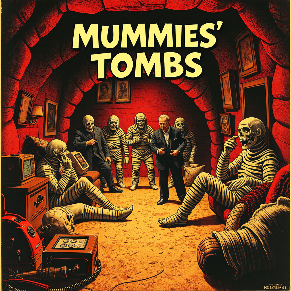 A lurid poster for "Mummies' Tombs", blending B-movie aesthetics with a twist of "mommy's on-the-phonecore"; a wild blend of crimson and brown tones. Imagine Marvel Comics' bold framing meets the surreal universe of carpetpunk, all tinged with a grotesque flair. The scene is enveloped in a whimsical yet eerie ambiance, characters frozen in mid-dialogue, surrounded by retro phones and sand-soaked carpets, mummies lurking in shadowy alcoves.