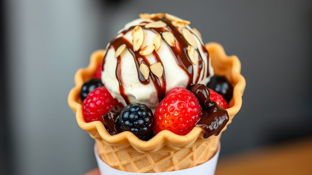 A luscious scoop of creamy ice cream nestled in a golden, half-sphere waffle cone, adorned with a medley of fresh, juicy berries and a drizzle of rich chocolate sauce, sprinkled lightly with toasted almond slivers for an extra crunch.