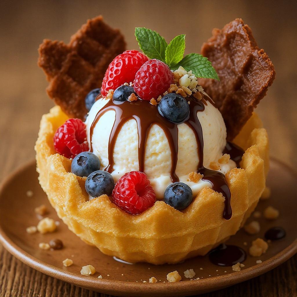 A luscious scoop of creamy ice cream nestled in a golden half-sphere waffle, adorned with a medley of fresh berries and a drizzle of rich chocolate sauce, sprinkled with crushed nuts and a hint of mint for a refreshing finish.