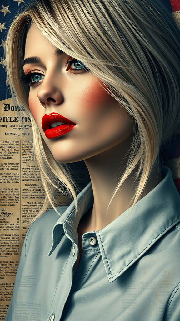 A lush and detailed fresco mixing realism and pop art, featuring a close-up of a stunning blonde woman with red lipstick, dressed in a collared oxford shirt, set against an overlay of an aged newspaper and the American flag. The composition is infused with pops of blue, white, and red, evoking a sense of black and white intimacy. Inspired by a blend of styles including Mike Deodato and Jan Frans van Bloemen, the piece showcases a slender figure exuding gentle lyricism and tenebrism-inspired contrasts. Emotional distortion is subtly woven in, drawing from the influences of Anton Fadeev and Lauren Faust. The detailed close-up bears a hint of Léon Bakst's expressive touch.