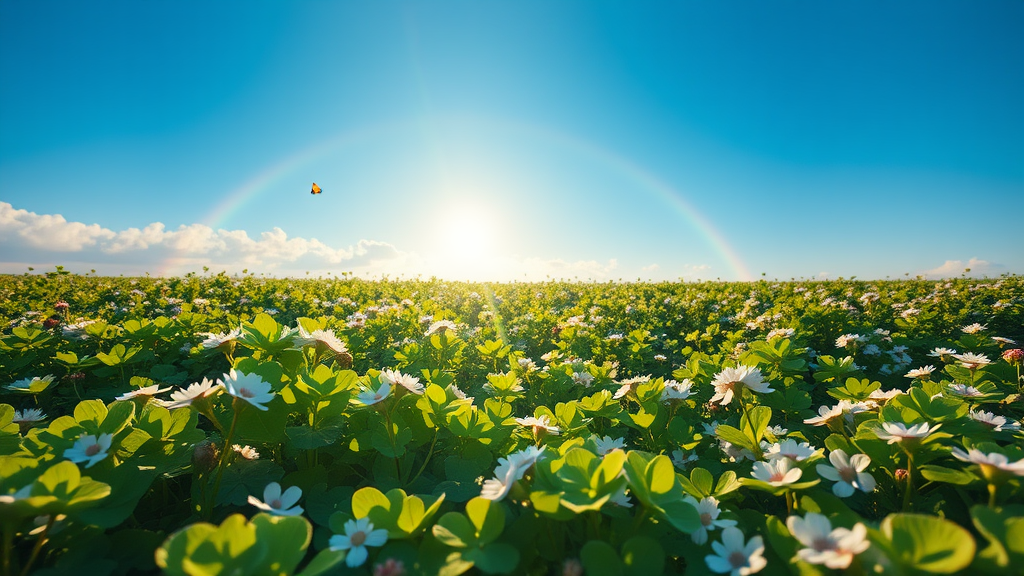 A lush and vibrant landscape filled with clover fields under a clear blue sky, the scene is captured in a cinematic 16:9 aspect ratio. Gentle sunlight filters through the leaves, casting playful shadows on the ground. In the distance, a rainbow arcs gracefully over the horizon, while small butterflies dance gracefully amidst the blossoms, bringing life and movement to the serene setting.
