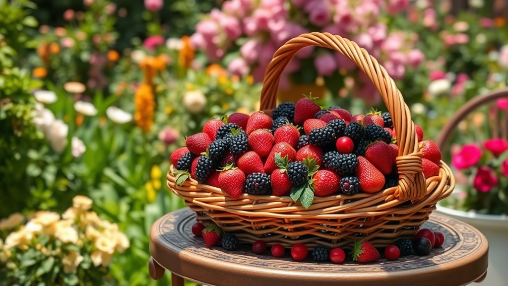 A lush arrangement of ripe berries—strawberries, blackberries, and cranberries—nestled in a finely woven Victorian-style wicker basket, sitting gracefully on an ornate garden table. The scene is set against the backdrop of a flourishing Victorian garden, where the vibrant hues of the berries are mirrored by the rich, colorful tapestry of blooming flowers and verdant foliage. The sunlight filters softly through the canopy, casting delicate shadows across the table, enhancing the intricate details of the fruits and their surroundings. A gentle breeze carries the faint scent of blossoms, adding a touch of whimsy to this timeless tableau.