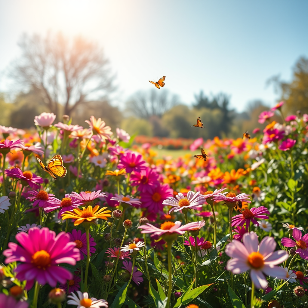 A lush garden bathed in the golden light of a spring morning, where vibrant flowers in full bloom paint a vivid tapestry across the landscape, the gentle hum of bees adding a melodic symphony to the air, playful butterflies dance gracefully among the blossoms, embodying the essence of nature's rebirth and the joy of springtime renewal, an atmosphere of pure bliss and serenity captured under a clear azure sky, conveying the essence of warmth and happiness.