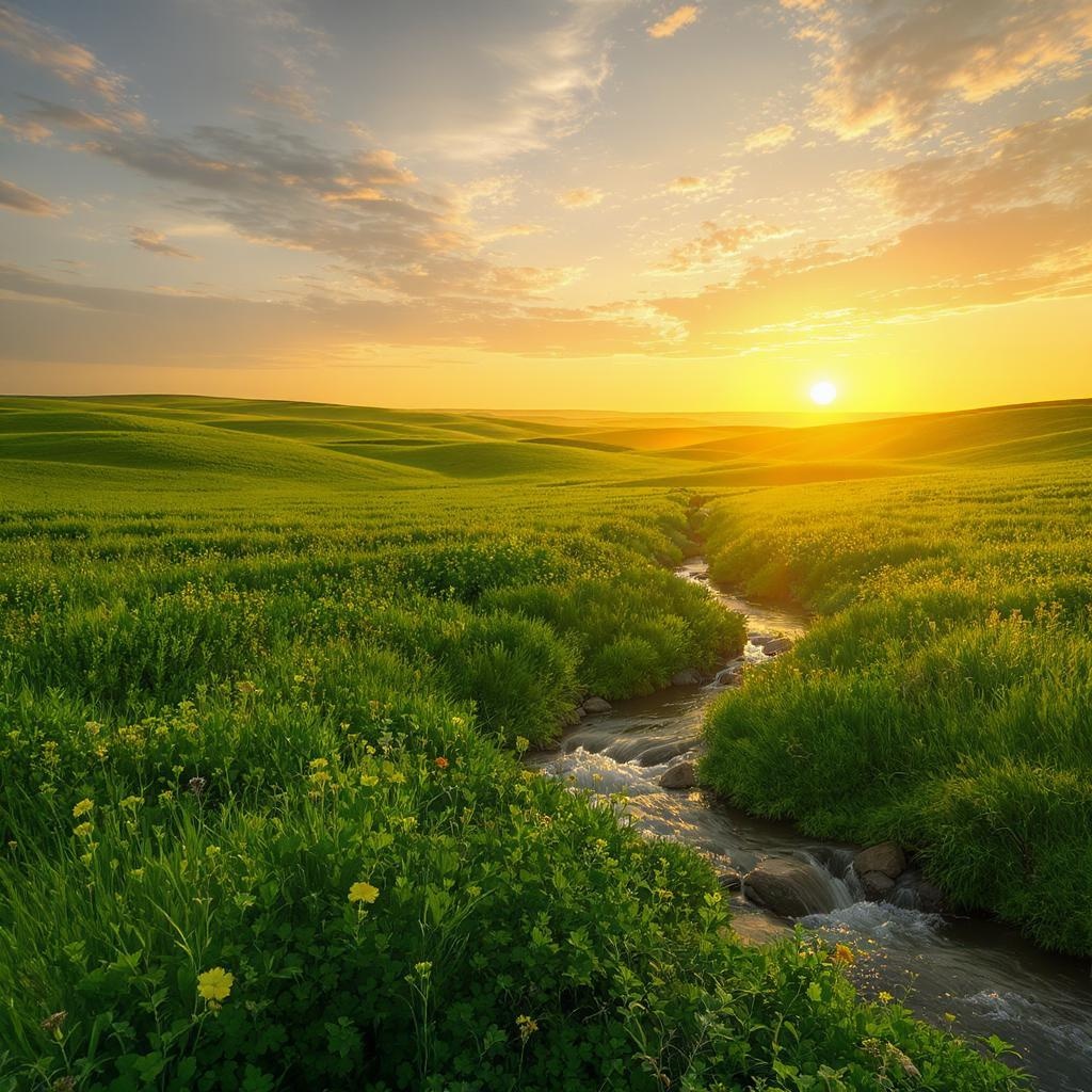 A lush, verdant landscape stretches across a wide horizon, filled with rich greenery and speckled with clovers. The setting sun casts a warm golden glow over the scene, enhancing the vivid colors of the foliage. In the foreground, a gentle stream winds through the landscape, its surface shimmering with reflected light. A few wildflowers add bursts of color, creating a serene and picturesque view that beckons the viewer to explore further. Ethereal wisps of clouds float lazily in the sky, complementing the tranquil ambiance of this pastoral paradise.
