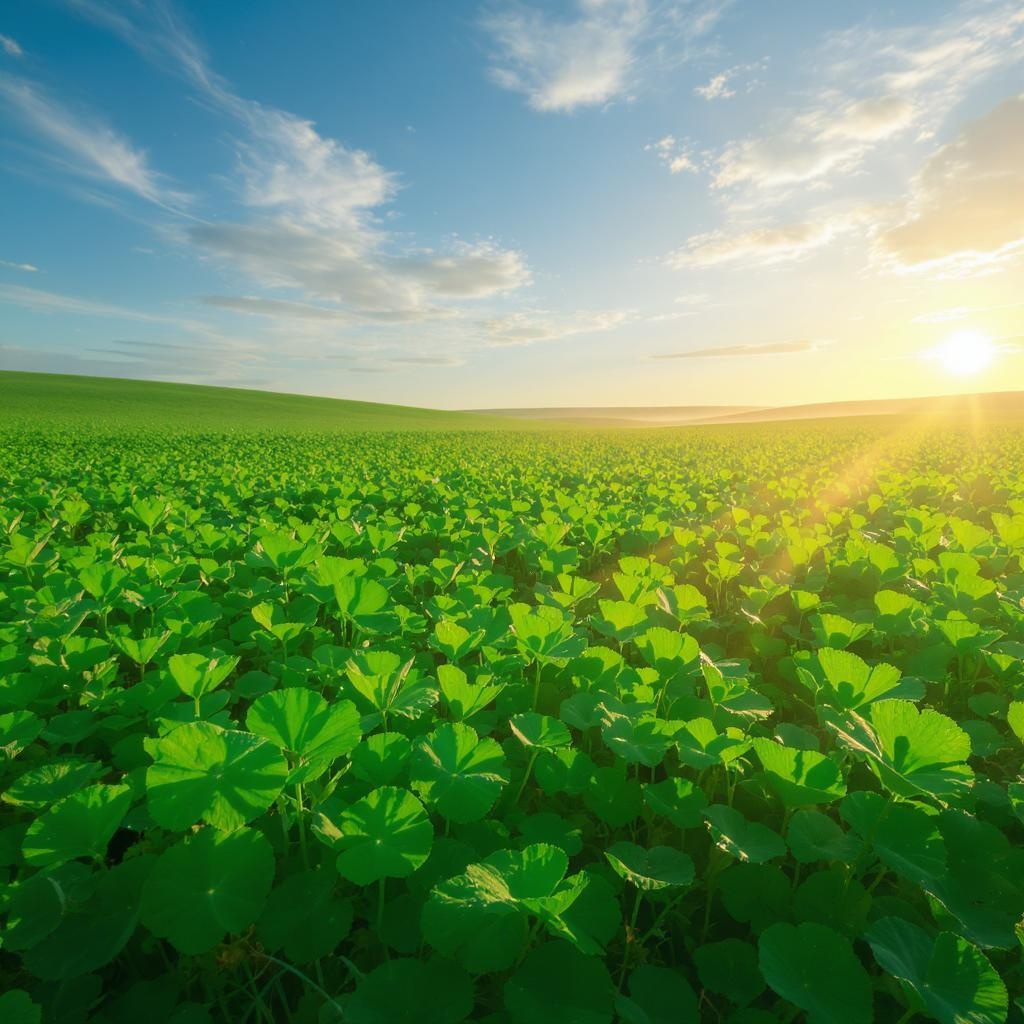 A lush, vibrant clover field stretching to the horizon under a serene blue sky, each leaf glistening with morning dew; rays of sunshine create a soft, golden glow, highlighting the tranquility of the scene; a gentle breeze rustles through, inviting a sense of peace and harmony.