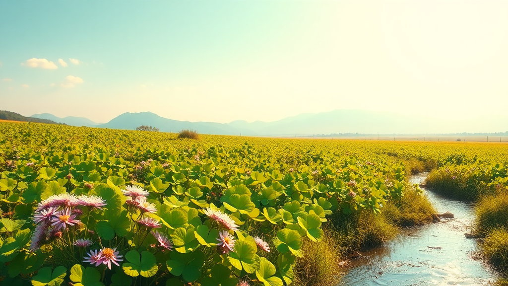 A lush, vibrant landscape under a bright, clear sky, showcasing a field of emerald green clovers swaying gently in the breeze. The scene is painted with soft, warm colors that evoke a sense of serenity and hope. In the foreground, a cluster of pink and white wildflowers adds pops of color, while a gentle stream reflects the golden sunlight. A distant, misty mountain range adds depth to the horizon, creating a harmonious balance in this peaceful, natural setting.