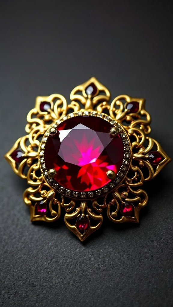 A lustrous Ruby brooch inlaid as a coveted game item, featuring intricate gold filigree with shimmering silver accents, exuding an aura of dark fantasy. The brooch's circular design is embellished with ornate details, evoking an allure both mysterious and enchanting.