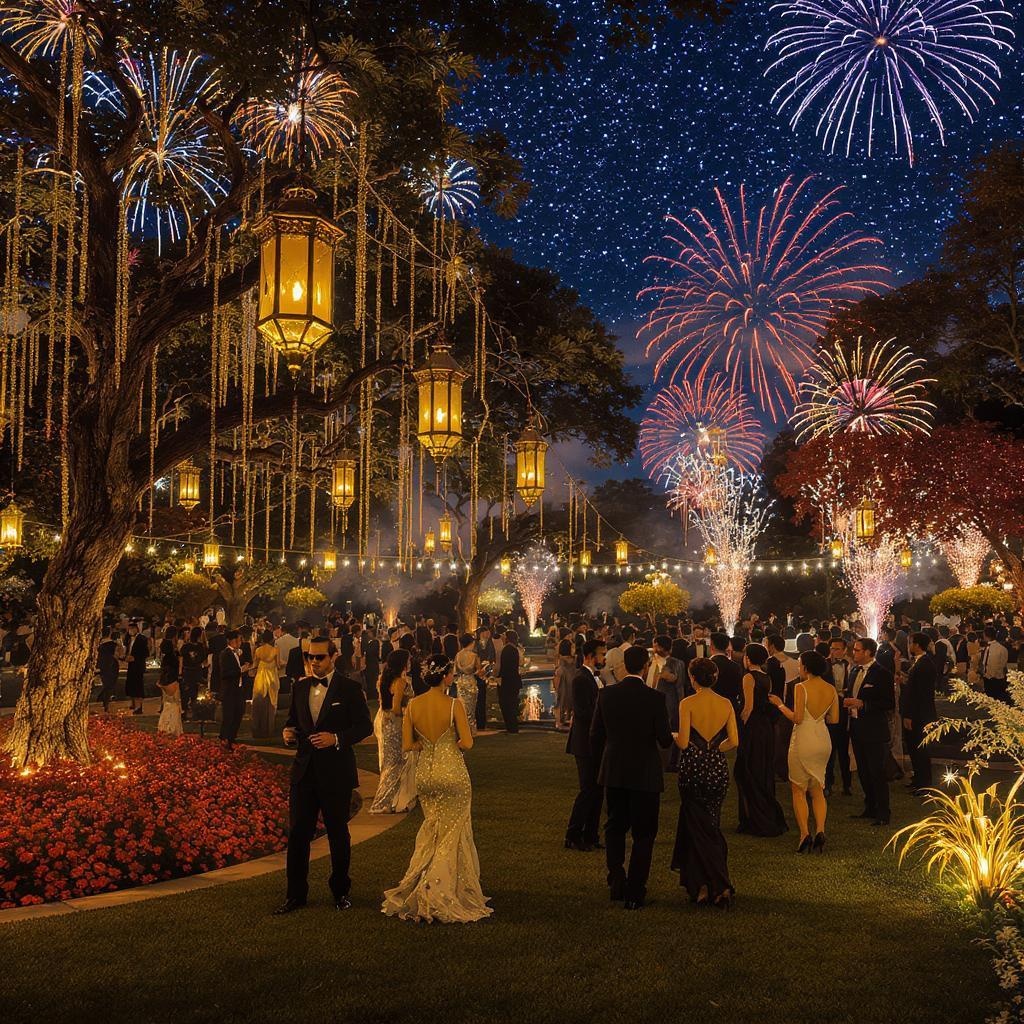 A luxurious 1920s-themed Gatsby party unfolds under a starry night sky, with a lively crowd of elegantly dressed guests dancing joyfully on a manicured lawn illuminated by ornate lanterns. Colorful fireworks burst overhead, casting vibrant reflections across the shimmering garden pond. The scene captures the essence of opulence and revelry, with meticulous attention to the intricate details of the era's fashion and decor, presented in stunning 8k resolution, providing a breathtaking visual experience.