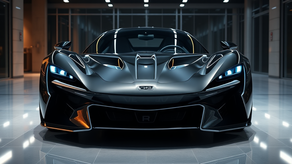 A luxurious 2023 supercar with a sleek black exterior and striking silver trim, prominently displayed from the front view in a sophisticated showroom setting; the car gleams under the precise showroom lights, showcasing a photorealistic finish rendered with Unreal Engine 5 in breathtaking 8k resolution, enhanced with ray tracing for sharp reflections and lifelike detail. The hyper-realistic scene captures every curve and edge of the vehicle, from its aerodynamic lines to its intricate grille structure, providing a stunning visual experience in HD, 4k, and 1080p quality, echoing an unreal level of realism and craftsmanship.