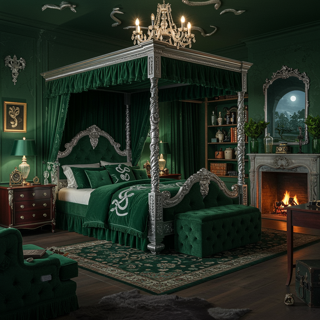 A luxurious bedroom draped in rich emerald and silver tones, filled with plush velvet drapery and snake-themed motifs. Dark mahogany furniture adds warmth, with an intricately carved four-poster bed as the centerpiece. Silver accents glimmer under the light of an ornate chandelier, casting subtle shadows on the deep green walls. A stone fireplace crackles softly, its mantle adorned with ancient-looking bottles and mysterious artifacts. Shelves lined with leather-bound books and a sleek writing desk provide an intellectual touch, while lush green plants add a touch of nature. A large window overlooks a moonlit landscape, completing the room’s enchanting and slightly mysterious ambiance.