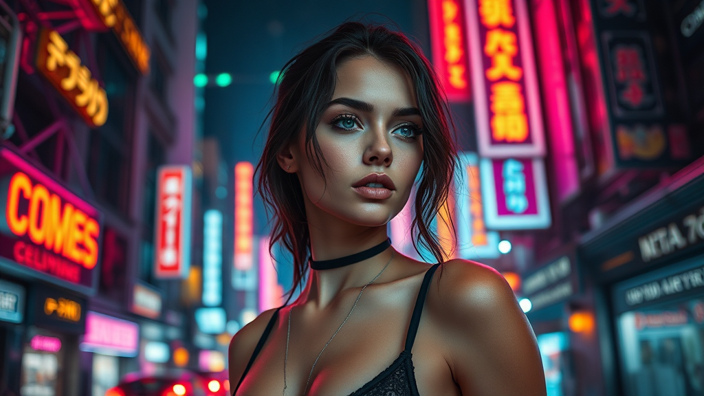 A luxurious camera captures the essence of a futuristic urban landscape, where vibrant neon lights create a cinematic ambiance. With expertly crafted practical lighting and digital effects, a female model stands out against this hyper-realistic, ultra-high definition cyberpunk universe.