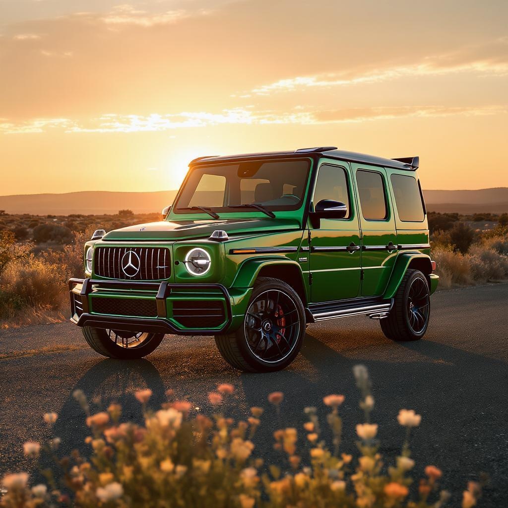 A luxurious emerald green Mercedes AMG G 63 parked under the golden glow of a setting sun, casting long shadows on the deserted asphalt road. The SUV's sleek, powerful design is accentuated by a shimmering metallic finish, reflecting the soft hues of the sky. Nearby, delicate wildflowers gently sway in the evening breeze, adding a touch of nature's artistry to the scene.