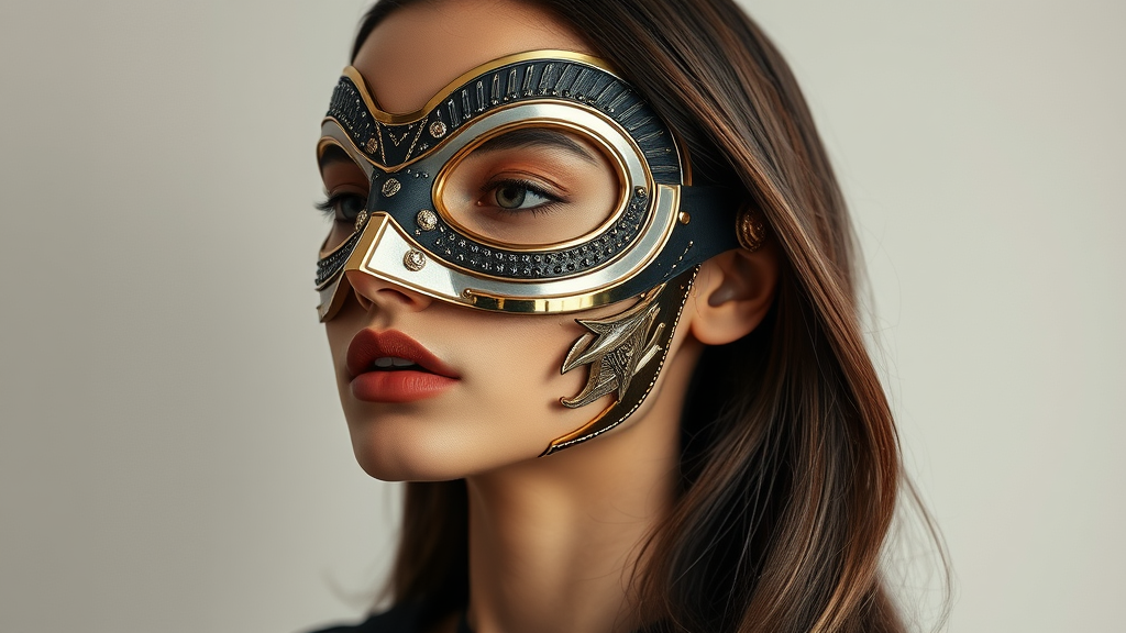 A luxurious face mask inspired by a face hugger, designed for Louis Vuitton, capturing the essence of high fashion. Photographed professionally, showcasing a stunning model adorned with an exquisite, intricately detailed mask that merges avant-garde design with the signature elegance of Louis Vuitton. The mask features refined textures and delicate embellishments, blending a unique sci-fi aesthetic with timeless luxury. Set against a minimalist backdrop to accentuate sophistication and allure, this piece redefines opulence and innovative design.