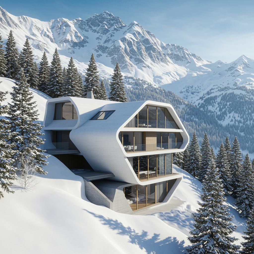 A luxurious futuristic Swiss house perched on a mountainside, featuring sleek white walls and expansive triangular windows that capture the breathtaking snow-covered scenery and surrounding pine trees. The design boasts fluid, curved forms, blending modern wood and concrete elements seamlessly. Its minimalist aesthetic is expressed through open-plan living areas with glass walls, offering unobstructed views of the majestic landscape. A rooftop deck enhances the experience with panoramic mountain vistas. Drawing inspiration from the styles of Bjarke Ingels, Zaha Hadid, and Frank Gehry, the house exudes clean lines and precise detailing, embodying a visionary architectural masterpiece.