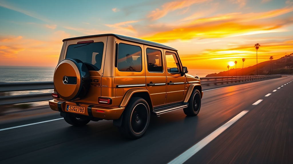 A luxurious gold Mercedes AMG G 63 cruising along a scenic coastal highway at sunset, the sleek silhouette reflecting the fiery hues of the sky, its power and elegance palpable; palm trees dotting the landscape, their shadows dancing on the glossy surface of the vehicle, capturing a moment of opulence and freedom.
