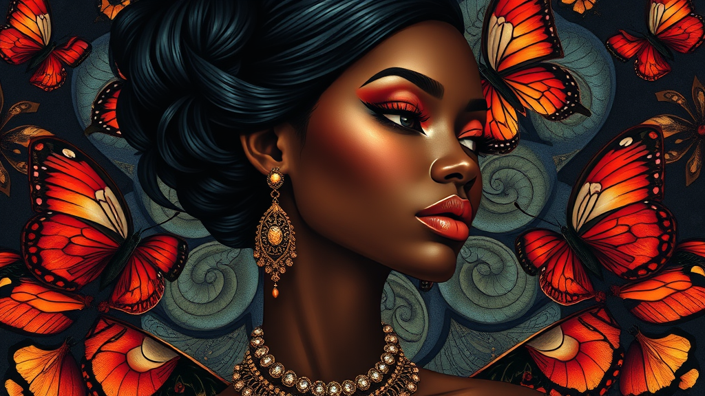A luxurious, intricate vector illustration in the style of oil painting, inspired by the seamless beauty of Damascus patterns. Featuring a black woman portrayed with elegance and grace, surrounded by symmetrical butterfly motifs. The piece embodies the artistic influences of Tom Bagshaw, Greg Rutkowski, Makoto Shinkai, Lois Van Baarle, and Ilya Kuvshinov. The image is bathed in a sophisticated color palette, with splashes of vivid hues, executed with high precision and sharp edges. The strokes are bold and deliberate, with an emphasis on fine detail, capturing the essence of opulence. No deformities or unrealistic features are present, maintaining proportion and elegance throughout the composition. The overall effect is one of detailed mastery, celebrating feminine beauty and intricate design with absolute clarity and refinement.